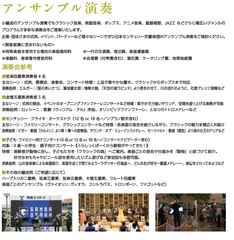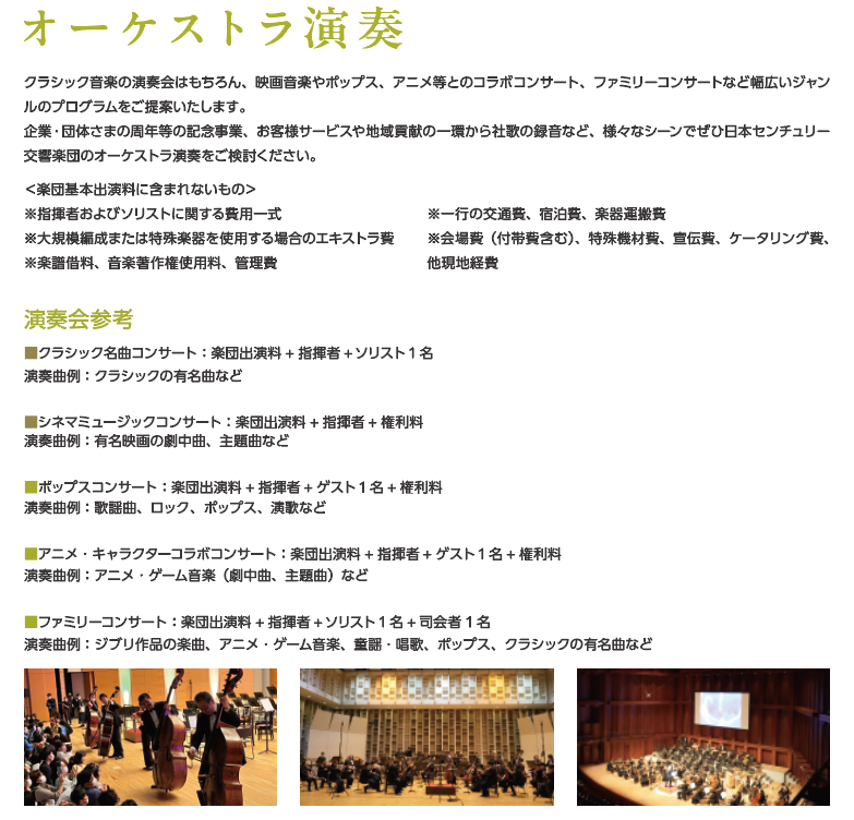 ABOUT US日本センチュリー交響楽団について HOME日本センチュリー交響楽団について社会貢献事業・アウトリーチ活動公演企画のご依頼 公演企画のご依頼 日本センチュリー交響楽団では、主催者様のご希望に応じてさまざまな公演企画をご提案させていただきます。弦楽四重奏や金管五重奏などの室内楽から大編成のオーケストラに至るまで、ご予算やご意向に沿った演奏会の企画をご提案いたします。どうぞお気軽にお問合せください。(開催日程についてはご希望に添えない場合もございます) お問合せ 06-6848-3333(平日10:00~18:00)